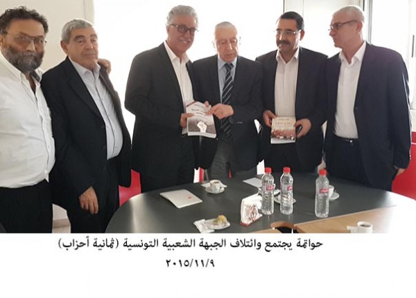 عقد نايف حواتمة الأمين العام للجبهة الديمقراطية لتحرير فلسطين مباحثات مطولة مع الأمناء العامين لائتلاف الجبهة الشعبية اليساري والقومي والناصري التونسي: حمة همّامي الناطق الرسمي للجبهة الشعبية وأمين عام حزب العمال وعضو مجلس الأمناء العامين، زهير حمدي أمين عام التيار الشعبي وعضو مجلس الأمناء العامين، محمد جمور أمين عام مساعد حزب الوطنيين الديمقراطيين الموحّد وعضو مجلس الأمناء العامين، رياض بن فضل المنسق العام لحزب القطب، منير كشوخ أمين عام الحزب القومي.