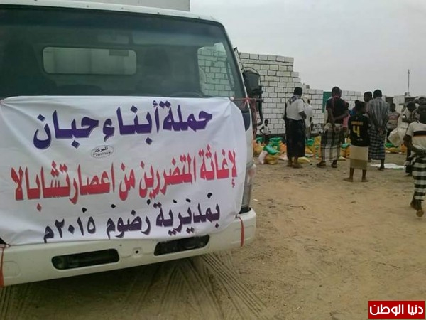انطلقت صباح يوم الاثنين 9 نوفمبر 2015م من مديرية حبان بمحافظة شبوة قافلة ابناء حبان الاهلية لاغاثة اهلهم في مديرية رضوم المكنوبة وتحمل مواد اغاثية ومبالغ مالية لاغاثة لاخوانهم المتضررين من اعصار تشابالا و وصلت القافلة الي منطقة جلعه المنكوبة من تاثير اعصار تشابالا ، وتم الاشراف على التوزيع السلل الغذائية والادوات و المبالغ الاغاثية من قبل اللجنة الاهلية ومدير عام مديرية حبان الذي رافق القافلة الاغاثية .