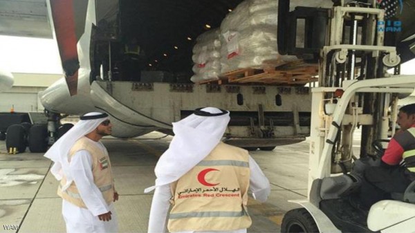 ونقلت الوكالة عن مسؤول فريق الإغاثة في الهيئة محمد سالم الجنيبي قوله إن حمولة الطائرة تتكون من الأرز و الطحين و التمور و الزيوت إضافة إلى كميات من الأغطية.