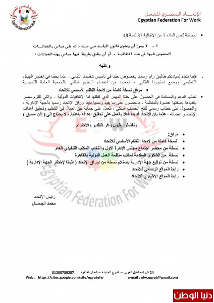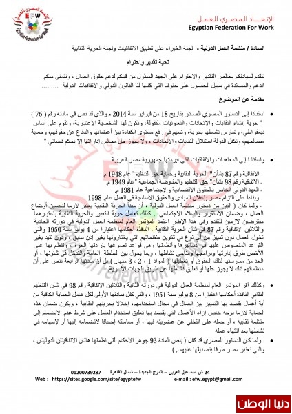 أعلن الإتحاد المصري للعمل أنه قد أرسل اليوم شكوى رسمية إلى لجنتي الخبراء على تطبيق الاتفاقيات والحرية النقابية بمنظمة العمل الدولية ، ضد - ما دعاه - انتهاكات وزارة القوى العاملة والهجرة المصرية للاتفاقيات الدولية فيما يخص الحق في التنظيم النقابي