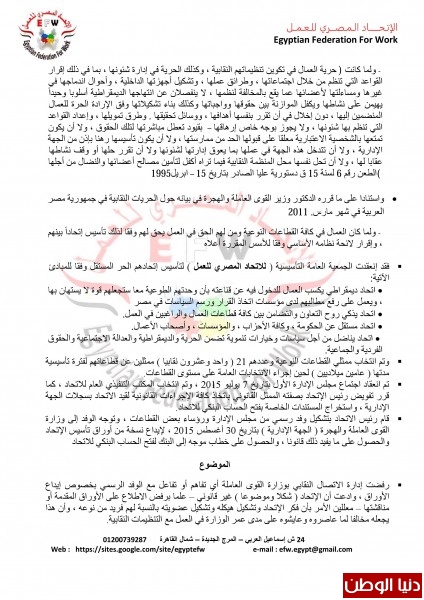 وأعلن محمد الجمال رئيس الاتحاد المصري للعمل ، أنه حاول مرارا تحديد موعد مع وزير القوى العاملة ولكن كافة المحاولات بائت بالفشل