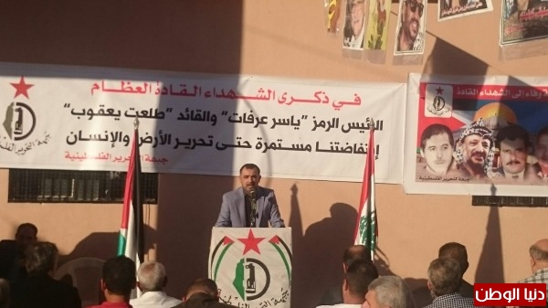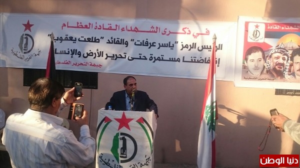 نظمت جبهة التحرير الفلسطينية وقفة تضامنية بذكرى استشهاد الرئيس الرمز ياسر عرفات والامين العام للجبهة طلعت يعقوب واستنكارا لمجزرة برج البراجنة وتضامنا مع الانتفاضة وقناة الميادين بحضور عضو المكتب السياسي للجبهة عباس الجمعة وعضو قيادة حركة امل صدر الدين داوود ومسؤول ملف المخيمات بحزب الله السيد ابو وائل زلزلي وعضو اللجنة المركزية لفرع لبنان في الجبهة الشعبية احمد مراد وعضو قيادة حركة فتح في منطقة صور ابو باسل شهاب وممثلي عن كافة الفصائل والقوى الفلسطينية والاحزاب اللبنانية ومدير موقع الرشيدية والمكاتب النسوية وحشد من الفعاليات وقيادة الجبهة ، وبعد الوقوف دقيقة صمت اجلالا واكبارا على ارواح شهداء مجزرة برج البراجنة شهداء لبنان وفلسطين وعزف النشيدين اللبناني والفلسطيني.