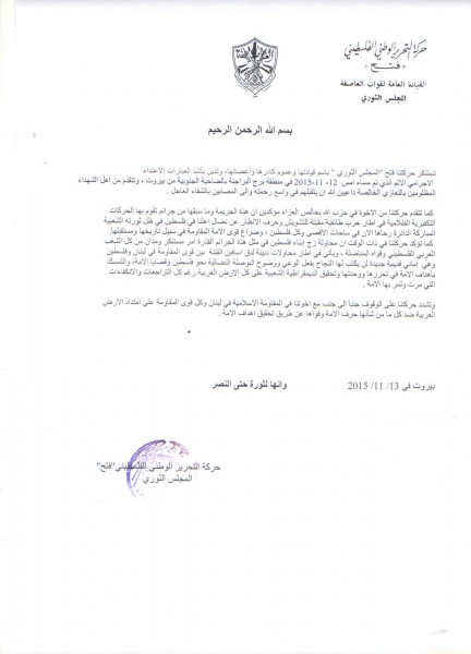 اخبار حركة فتح تستنكر تفجيرات برج البراجنه في لبنان 2015-11-16 رابط مختصر: تابعنا أيضا عبر انستجرام instagram/alwatanvoice رام الله - دنيا الوطنوصل " دنيا الوطن " بيان صادر عن حركة فتح تستكر به التفجيرات الأخيرة في لبنان