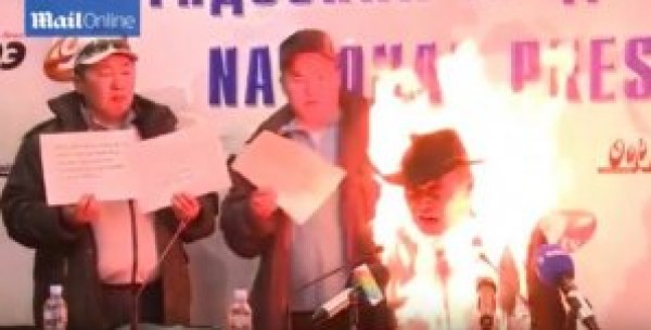 في مشهد مروع أمام كاميرات التلفزة قام رئيس اتحاد التجارة المنغولي بإضرام النار بنفسه للاحتجاج على بيع بلاده للفحم للصين.