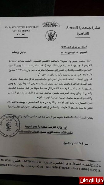 "مرفق :"بشأن ما ذكرت الوزارة والسفارة انه "حملات خاصة لتفتيش السودانيين واحتجازهم وان الامر تزايد فى الفترة الاخيرة
