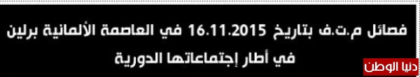 وتوقف الإجتماع أمام ما يسمي ب" مؤتمر الشتات الأول ـ اوروبا" المزمع عقده في برلين أواخر شهر تشرين الثاني، واكد المجتمعون على ان قضية الشتات هي قضية وطنية بامتياز ولا يجوز اللعب بها وهي ملك للكل الوطني الفلسطيني بكافة فصائله وقواه السياسية ومنظمات مجتمعه المدني (الأهلي)، ولا يجوز احتكارها من قبل طرف بعينه او شخص بذاته. وأكد على ان فصائل م ت ف وأنصارها ليس لهم علاقة بهذا المؤتمر. كما اكد الإجتماع على اهمية المشاركة في المؤتمر القادم للإتحاد العام للمهندسين الفلسطينين بتاريخ 21.11.2015 لتصليب بنيته وتحسين أدائه بما يكفل دعم قضايانا الوطنية.