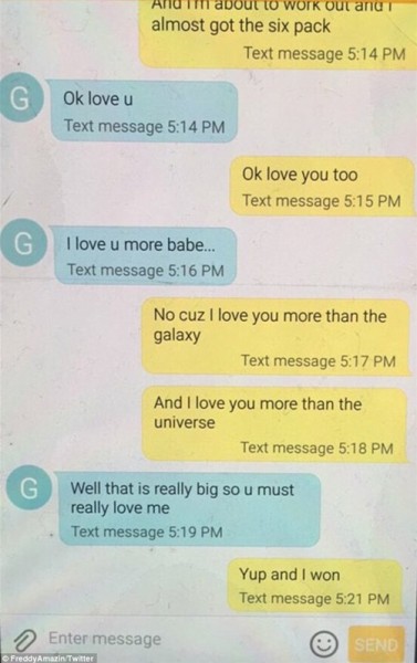 نشر شاب محادثة أخيه الأصغر مع حبيبته عبر تويتر، حيث كان الاثنان يتحدثان حول علاقتهما، وفقا لما نشرته صحيفة "ديلى ميل" البريطانية، أفصح الطفل لحبيبته أنه يحبها أكثر من المجرة وسيحضر دولارا إضافيا للمدرسة كى يشترى لها الآيس كريم.