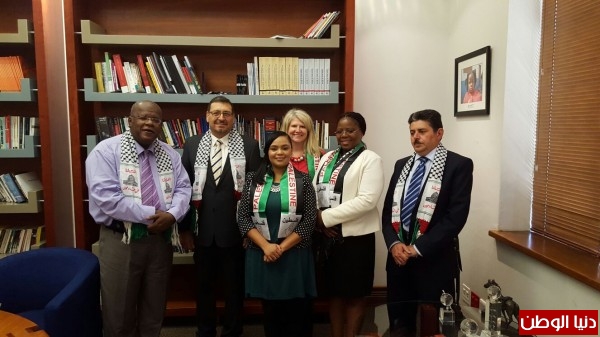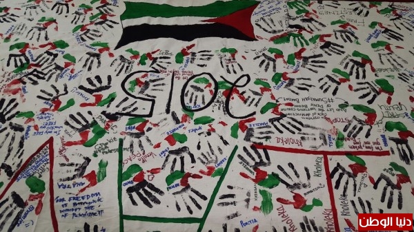 الشامل واهمية التضامن الدولي الرسمي والشعبي ، كما قدم ناشطون للسفير قطعة قماش بطول 4 امتار مطبوعة بأكفف اليد بلون العلم الفلسطيني والعبارات التضامنية الرائعة وممهورة بتوقيع مئات الطلاب تضامنا مع الشعب الفلسطيني.