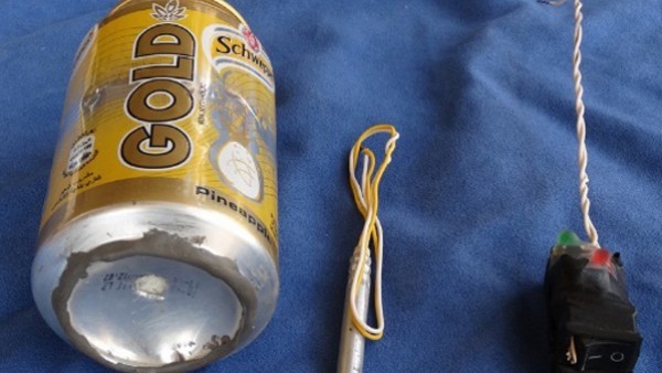 وتظهر الصورة علبة مياه غازية، وبجنبها سلك معدني.