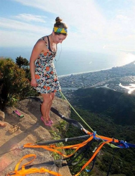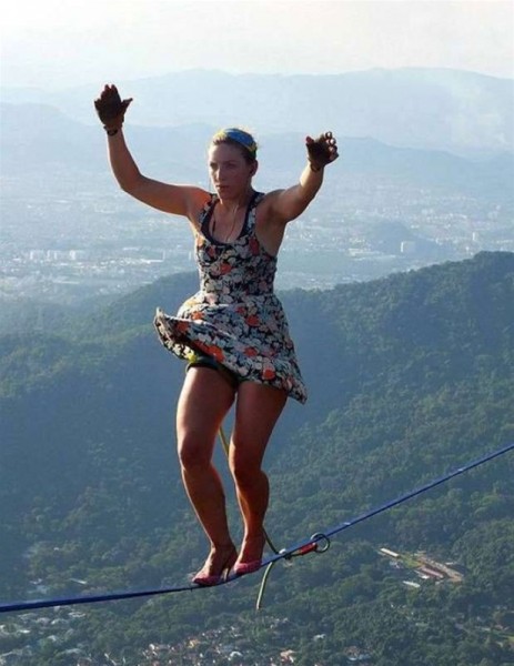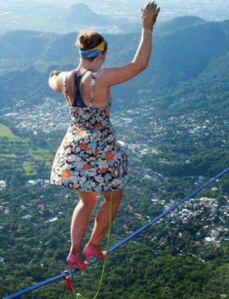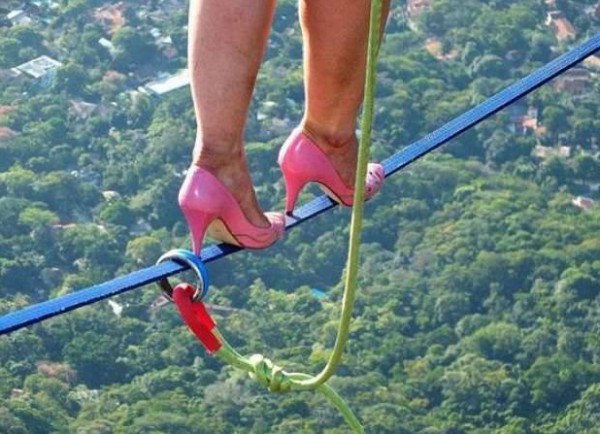 استطاعت المغامرة فيث ديكي 26 عاما، أن تمشي على حبل مشدود على ارتفاع 840 مترا، فوق سطح البحر، مرتدية حذاءً عالي الكعب، وذلك في احتفالية عيد الكعب العالي بالبرازيل.
