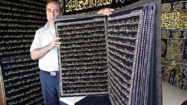 صور: فنان سوري يخط المصحف على قماش مقصّب المذهب ويطلب حفظه في تركيا