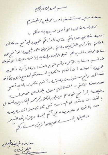 كتبت معلمة سعودية توفيت غدراً على يد زوجها بطلقات نارية داخل منزلها بضباء بخط يدها، ووجّهته لمدير مستشفى قبل ثلاثة أسابيع من وفاتها، تُقَدّم فيه الشكر لهم؛ لما لمسته من رعاية أثناء تنويمها.