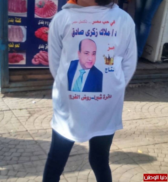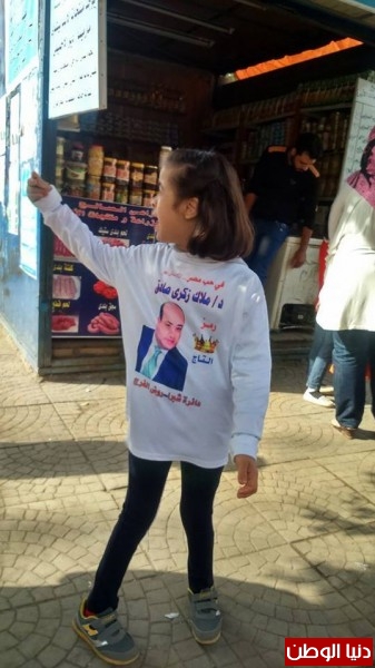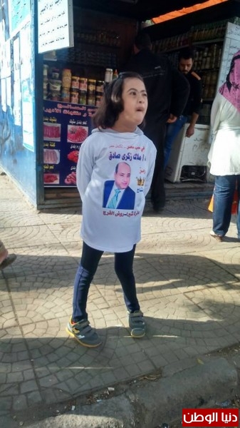 معاقة فى الدعاية الإنتخابية أمام لجنة المدرسة التوفيقية بروض الفرج , مرتدية تي شيرت للمرشح ملاك ذكي صادق