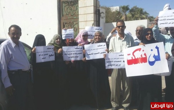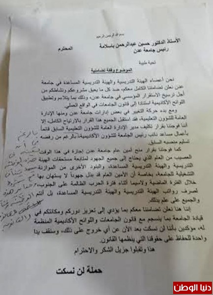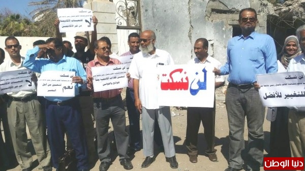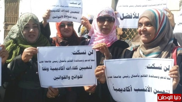 نفذ عدد من أعضاء الهيئة التدريسية والتدريسية المساعدة بجامعة عدن اليوم الثلاثاء وقفة احتجاجية (حملة لن نسكت)، وذلك لدعم ومساندة القائم بأعمال رئيس جامعة عدن، ضد كل مايعيق مشروعه ونشاطه لترسيخ الاستقرار المؤسسي في جامعة عدن.