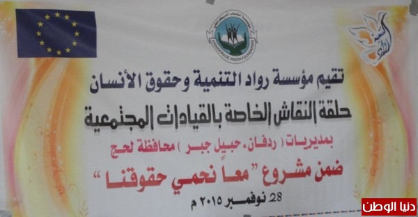 نفذت مؤسسة رواد التنمية وحقوق الانسان اليوم السبت بمدينة الحبيلين مديرية ردفان محافظة لحج حلقة النقاش الخاصة بالقيادات المجتمعية ضمن مشروع " معاً نحمي حقوقنا " وتحت شعار " بشراكتنا نؤمن حياتنا ونحمي مجتمعنا " وذلك