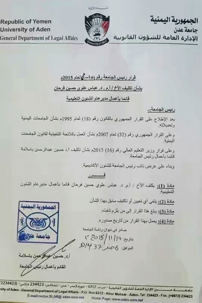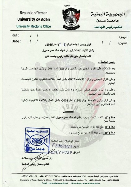 حيث اصدر قرارا بتعيين د. ضياء خالد عمرمحيرز مديرا لمكتب رئيس جامعة عدن بدلا عن د. ميسون ابراهيم عقربي. واصدر قرارا بتعيين د. عباس علوي حسين فرحان مديرا للشئون التعليمية بجامعة عدن بدلا عن أ. وجدي محمد عبدالله محمد الجنيدي.
