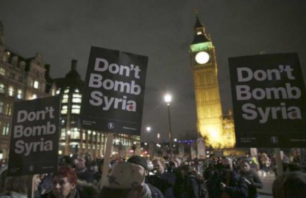 وردد المتظاهرون عبارات “لا للقصف في سوريا” او “ديفيدي كاميرون عار عليك” رافعين يافطات كتب عليها “اوقفوا الحرب”.