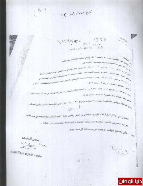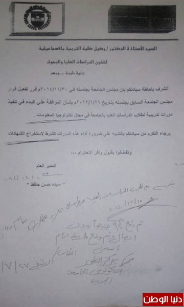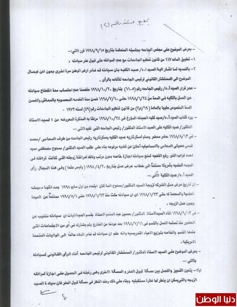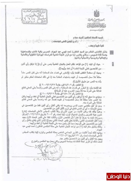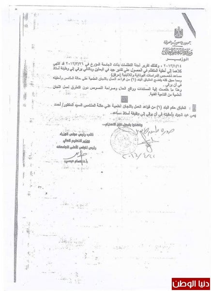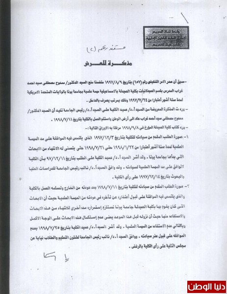 رفع المشرف من علي إشرافهما بطريقة غير قانونية مخالفة بذلك قرار مجلس الكلية يراجع في ذلك مجلس الكلية رقم (183) وتاريخ 11 / 6 / 2013م ، وتجاهل لائحة الجامعة الصادرة في 2001م والتي تحتم علي رئيس القسم رفع اسم أ.د محمود عباس عابدين من علي الأشراف خاصة وأنه لم يقضي مع الطالبتين غير شهران فقط وتسعة أيام في الإشراف على إحداهما ، وتسعة أشهر على الأخرى وهذه مخالفة للائحة الجامعة الصادرة المعتمدة من مجلس الجامعة في 28/ 4/ 2001م ،وتم تعديل لجنة المناقشة لهما في 1/ 12 / 2013م وتمت المناقشة صباح يوم 5 / 12 / 2013م واللائحة تحتم مرور خمسة عشر يومًا من تاريخ التعديل سعادة نائب رئيس الجامعة للدراسات العليا وقع علي المناقشة بتاريخ 3 / 12 / 2013م , كما وقعت الأستاذة سيدة عبد الحافظ بتاريخ 4 / 12 / 2013م وفي صباح اليوم التالي يوم 5 / 12 / 2013م ، و تمت المناقشة ، فكيف ذلك ؟! ومتى وضع الإعلان عن الدكتوراه؟! وهل بذلك يكون قد مر عليه ثلاثة أيام ؟! ، مؤكدا أنه منح وتعيين الطالبتين المدرستين المساعدتين من خلال مجلس القسم وبدون وجود أي أوراق في المجلس تدل علي أنهما حصلا علي الدكتوراه ، وأن المجلس لا يعرف عن مناقشتهم شيء فقد تمت مناقشتهم بعيدًا عن الكلية في نادي أعضاء هيئة التدريس وبعيدًا عن موافقة مجلس القسم وبدون أي ورق رسمي يدل علي أنهما حصلا علي الدكتوراه .