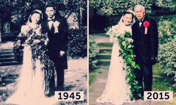 احتفل زوجان مسنان من الصين بمرور 70 عامًا على زواجهما بطريقه مبتكرة، وذلك بتكرار أسعد اللحظات التي مروا بها في شبابهما، بداية من ليلة الزفاف، ومرورًا بسنواتهم الأولى كزوجين في بداية مشوارهما، وبحسب موقع "Brightside" ، فقد ساعدهم أولادهم الأربعة فى التقاط الصور نفسها التى أخذوها قبل 70 عامًا.