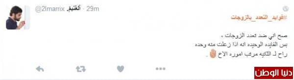 على تويتر دشّن أحد المغرّدين هاشتاج ساخر لفوائد تعدد الزوجات الذي انقسم ما بين مناصر ومعارض لتعدد الزوجات ن فيما عدد المناصرين لتعدد الزوجات فوائد جمّة لها ، أما المعارضين فتمسّكوا بالعدل بين الزوجات الاربعة والمقدرة