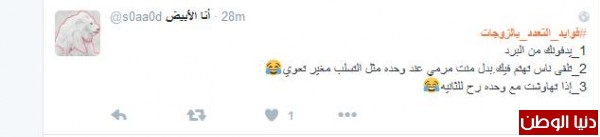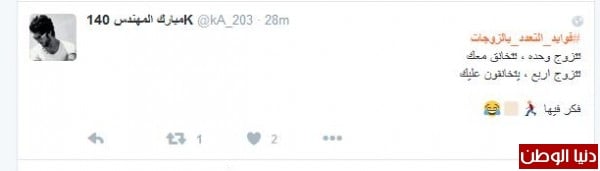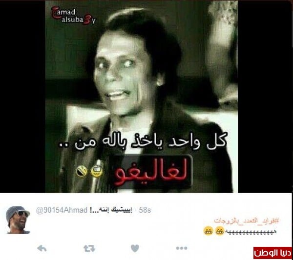 سعود غرّد معددا فوائد تعدد الزوجات : "#فوايد_التعدد_بالزوجات 1_يدفونك من البرد 2_تلقى ناس تهتم فيك.بدل منت مرمي عند وحده مثل التسلب مغير تعوي 3_إذا تهاوشت مع وحده رح للثانيه" وافقه المهندس مبارك : "#فوايد_التعدد_بالزوجات تتزوج وحده ، تتخانق معك تتزوج اربع ، يتخانقون عليك"