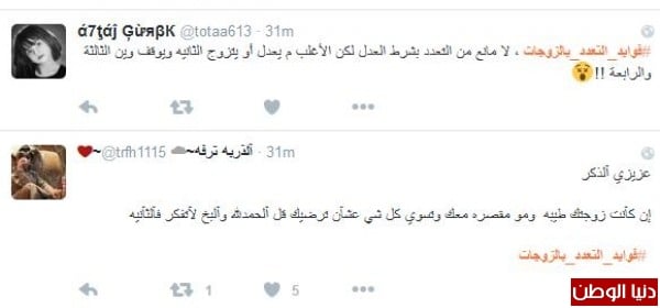 احدى المغردات وافقت بشرط العدل وغرّدت : "#فوايد_التعدد_بالزوجات ، لا مانع من التعدد بشرط العدل لكن الأغلب م يعدل أو يتزوج الثانيه ويوقف وين الثالثة والرابعة !! "، اما محمد المسعود فغرّد :"#فوايد_التعدد_بالزوجات أن تعف نفسك عن الحرام وتطبيق السنة النبوية وتقليل العنوسة بين النساء ولكن من استطاع ان يعدل فاليتوكل #ابوبندر_المسعود"