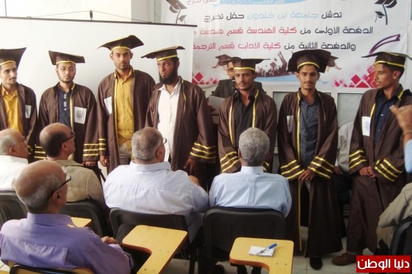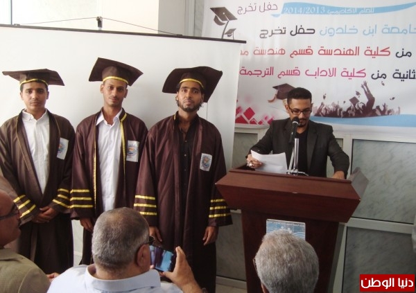 إلى ذلك قام الدكتور/صالح علي باصرة رئيس مجلس أمناء جامعة ابن خلدون، والدكتور/عوض البكري رئيس الجامعة، والدكتور/عبدالله عمر بن دحمان عميد كلية الهندسة، والدكتور/أحمد حنشور عميد كلية الآداب، بتقديم شهادات التخرج للطلاب المتخرجين من قسم الهندسة المدنية وقسم الترجمة، لمساق البكالوريوس بكليتي الهندسة والآداب.