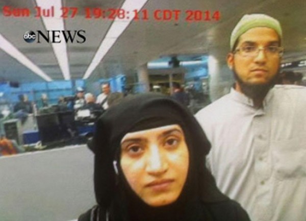 نشرت قناة ABC الأمريكية صورة للزوجين "سيد فاروق" و"تشفين مالك" اللذان نفذا عملية إطلاق النار بضاحية "سان بيرناردينو" بولاية كاليفورنيا الأمريكية، ليحصدا أرواح 14 مواطن أمريكى قبل أن تتمكن السلطات الأمريكية من قلتهما، والصورة تعود إلى يوليو 2014 أثناء مرور الزوجين بجمارك مطار "شيكاجو أوهير" الدولى.