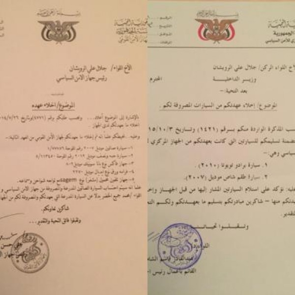 وأكدت وثيقة إخلاء العهدة التي تقدم بها القائم بأعمال رئيس جهاز الأمن السياسي على إستلام السيارتين المشار إليها من قبل الجهاز وإخلاء عهدة اللواء جلال الرويشان منها عندما كان يشغل منصب رئيس جهاز الأمن السياسي العام الماضي.