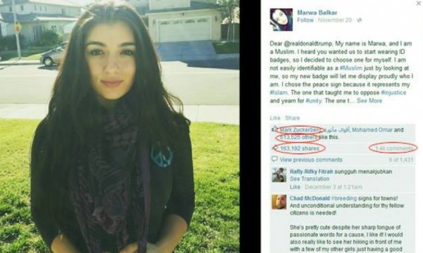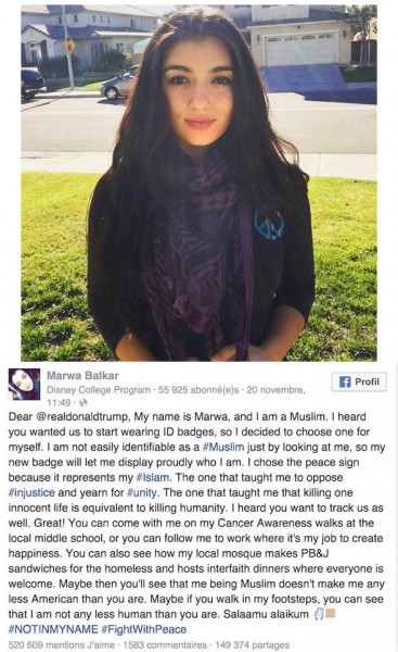 “عزيزي دونالد ترامب، اسمي مروة، مسلمة، سمعت بانك ترغب منا أن نرتدي شارات هوية، لإظهار أننا مسلمين، ولهذا قررت أن اتخير لنفسي واحدة، إذ لا يمكن التعرف علي بسهولة كمسلمة بمجرد النظر إلي، ولهذا تركت لك الشارة التي ارتديها لتعلمك من أنا بفخر، الشارة التي تخيرتها هي شارة السلام، لأنها أنسب ما يمكن أن يشير إلى ديني، وتعاليمه، إنه الدين الذي حثني على نبذ الظلم، وأمرنا بالوحدة، هو الدين الذي علمني أن قتل نفس بريئة بغير ذنب يعني قتل الإنسانية جميعًا، علمت أنك تريد تتبعنا، عظيم، يمكنك تتبعي في المسيرات التي أنظمها لأجل التوعية بمرض السرطان بالقرب من المدرسة المحلية، أو متابعتي في عملي الذي يهدف إلى خلق السعادة لدى الجميع، يمكنك كذلك ان تلاحقني لدى المسجد الذي ارتاده، والذي يقوم بإعداد وجبات للمشردين، ويرحب بهم جميعًا في صحنه مهما كانت ديانتهم، فربما بعد تلك المتابعة والملاحقة، تدرك من أنا وتعرف أنني كمسلمة لا أقل إنسانية عنك. سلام عليكم.”