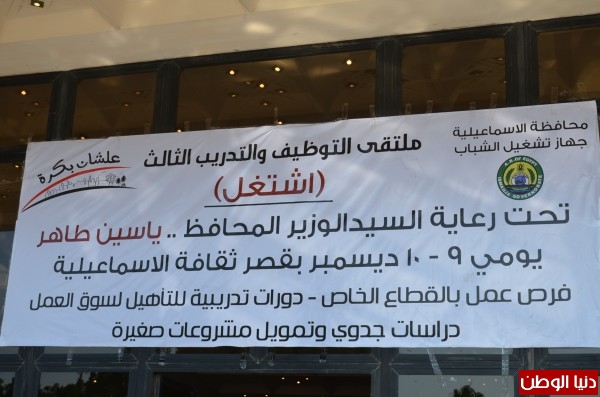 تشغيل شباب الخريجين بالمحافظة ووسط حضور حشد جماهيرى كبير من أبناء الاسماعيلية بافتتاح فعاليات ملتقى التوظيف الثالث للشباب والذى أقيم بقصر ثقافة الاسماعيلية بمنطقة الشيخ زايد بحى ثالث على مدى يومى 9 -10 ديسمبر 2015