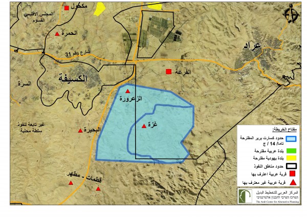 أكد المركز العربي للتخطيط البديل ان قرار المجلس القطري للتنظيم والبناء من الاسبوع الماضي بتوسيع مقلع الفوسفات المعرف ب"حقل برير" يأتي اولا على حساب قريتي غزة والزعرورة الغير معترف بهما وعلى قسم من اراضي الفرعة.