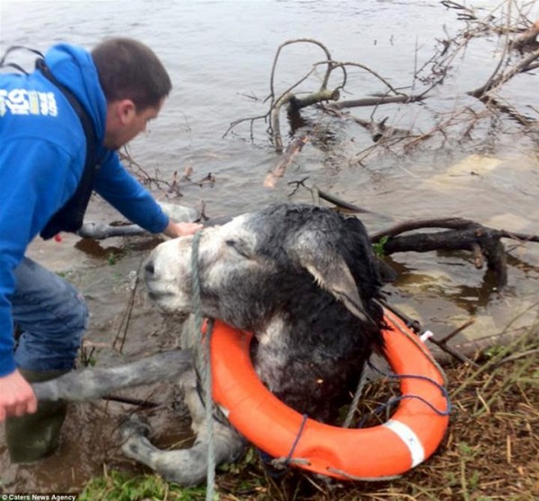 وفقا لما نشرته صحيفة "ديلى ميل" البريطانية، أنقذ أعضاء نادي التجديف الحمار بانتشاله من الفيضانات التي نجمت عن العاصفة التي ضربت البلاد في وقت لاحق، وتمكنوا من جذبه بالحبال وطوف وانتشاله من المياه لبر الأمان ليظهر في إحدى الصور وهو يضحك فرحا بنجاته.