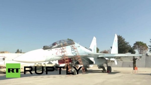 يظهر شريط مصور التقط في قاعدة "حميميم" الجوية القريبة من اللاذقية طريقة إعداد مقاتلة "سو-30 إس إم" للإقلاع وتنفيذ مهمات قتالية في سماء سوريا.
