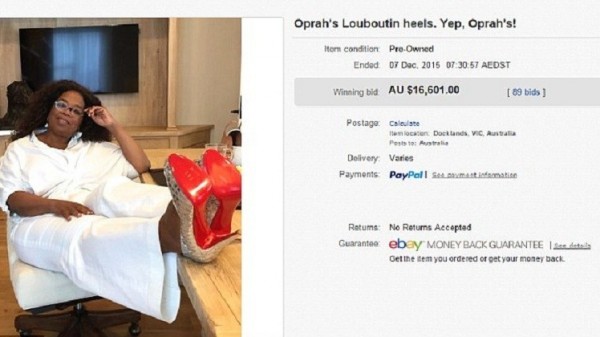 بيع حذاء الإعلامية أوبرا وينفري الذي يحمل ماركة كريستيان لويس وذو اللون الفضي والكعب العالي على موقع " eBay" بما يقارب 17 ألف دولار خصصتها لمساعدة مقر "ملبورن الخيري"