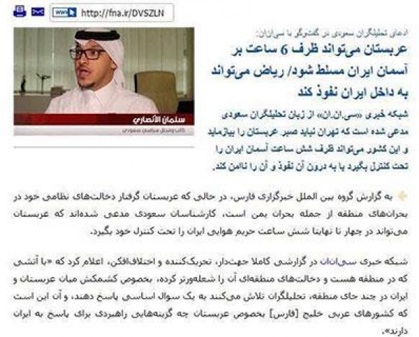 وكانت وكالة الأنباء الإيرانية "فارس" شنت هجومًا على الأنصاري بعد أن صرح لـ"CNN" في وقت سابق، أنه باستطاعة المملكة السيطرة على الأجواء الإيرانية خلال ساعات، وأن على طهران عدم اختبار حلم السعودية أبدًا.