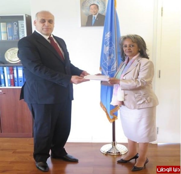 قدم سعادة السفير د. نصري ابو جيش أوراق إعتماده للسيدة ساهليه ورك زيوديه مساعد الامين العام للامم المتحدة بان كي مون والمديرة العامة لمكتب الامم المتحدة بنيروبي كمندوب دائم لدولة فلسطين لدى مكتب الامم المتحدة والمنظمات