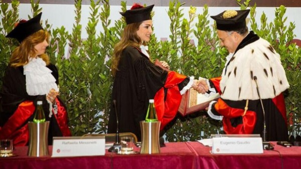 ضمن زيارة العمل التي يقوم بها الملك عبدالله الثاني إلى جمهورية إيطاليا، تسلمت الملكة رانيا العبدالله اليوم في روما شهادة الدكتوراه الفخرية في "علم التنمية والتعاون الدولي" من جامعة سابينزا التي تعتبر من أعرق الجامعات في أوروبا، وذلك لجهودها في تشجيع الحوار ومحاربة الإرهاب والأفكار الظلامية.