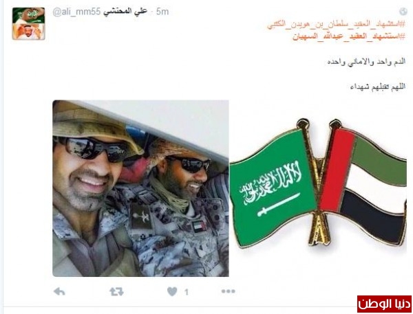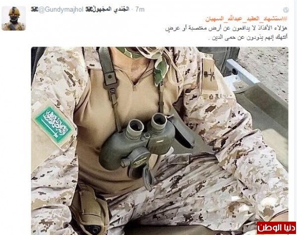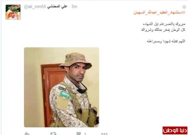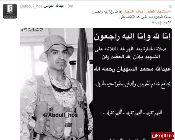 صباح الأمس استشهد العقيد الركن السعودي عبدالله بن محمد السهيان، أثناء سير عمليات في مدينة تعز اليمنية، فمنحه الرئيس اليمني وسام الشجاعة .
