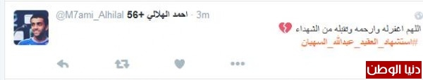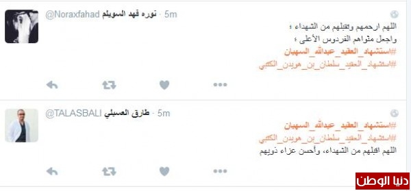 على تويتر نعى رواده العقيد السهيان متناولين صفاته الشجاعه التي تحلّى بها أثناء فترة عمله في الجيش وقوات التحالف لمحاربة الارهاب في اليمن .