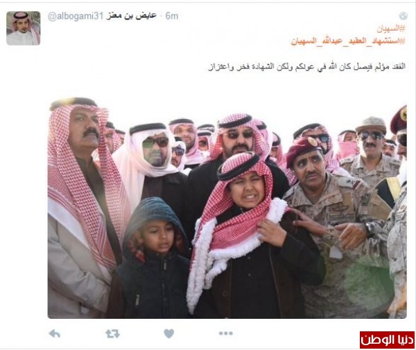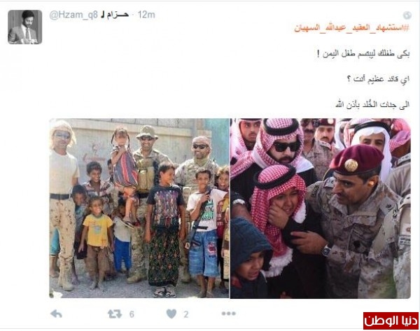 حزام غرّد ناعيا السهيان ومشاركة صورة لطفله باكيا : "#استشهاد_العقيد_عبدالله_السهيان بكى طفلك ليبتسم طفل اليمن ! اي قائد عظيم أنت ؟ الى جنات الخُلد بأذن الله ".