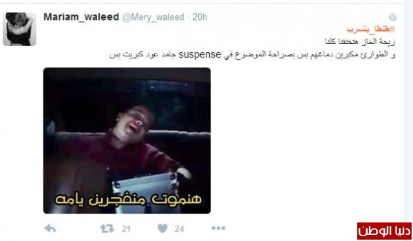 على الهاشتاج غرّد أحدهم ساخرا عن وجود غاز بأجواء المدينة : "محدّش يولّع سيجارة"، فيما حذّر أحدهم من الاشاعات مغرّدا : "الغريب ان احنا ننساق وراء الاشاعات والاخبار الغريبه الغير صحيحه بدون وعى ولا تفكير وهات ياشتيمه وسخريه فين عقلك؟!"، فيما غرّد ثالث : "ريحونا وخلصونا ,,, عود كبريت يكفينا".