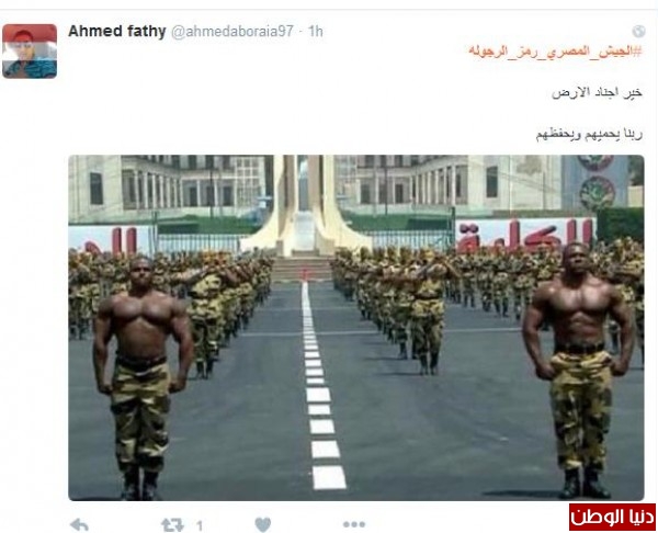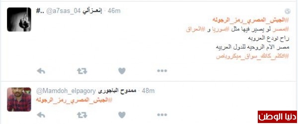 أحد المغرّدين على الهاشتاج الذي لم يخلو من شعارات "معارضين" للنظام كتب :" #الجيش_المصري_رمز_الرجوله #مصر لو يصير فيها مثل #سوريا و #العراق راح نودع العروبه مصر الام الروحيه للدول العربيه " ، فيما غرّد آخر : " #الجيش_المصري_رمز_الرجوله لولا جيشنا البطل لضاعت مصر وكنا زي سوريا وليبيا واليمن والعراق حفظكم الله ياحماة الوطن"