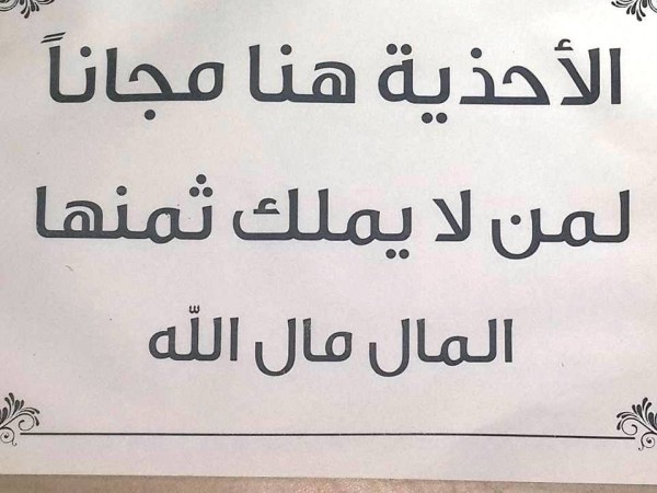 ففي وسط مدينة جنين علق صاحب محل تجاري لبيع الأحذية ,على واجهة المحل الأمامية لافتة كتب عليها: "الأحذية هنا مجانا لمن لا يملك ثمنها..المال مال الله".
