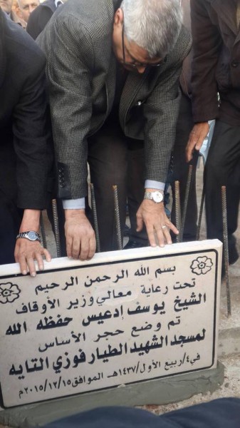 تحت رعاية سماحة الشيخ يوسف ادعيس وزير الأوقاف والشؤون الدينية، احتفلت مديرية أوقاف نابلس بوضع حجر الأساس لمسجد الشهيد الطيار فوزي التايه في قرية بيتا بحضور رسمي وشعبي.