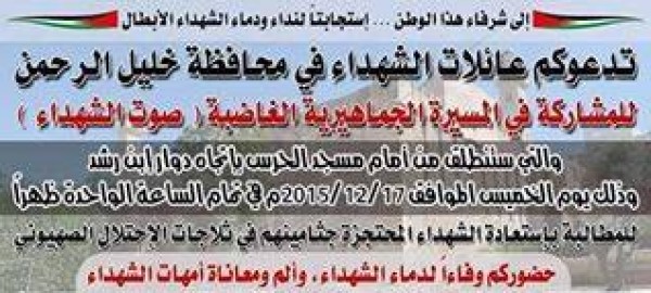 دعت هيئة التنسيق الوطني للقوى السياسية في محافظة الخليل، الى اعلان الاضراب يوم الخميس لمدة ساعتين، كما دعت لأوسع مشاركة في المسيرة المطالبة باسترجاع جثامين الشهداء.