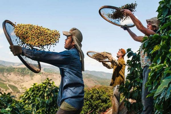 مزارعون ينظفون بذور القهوة من حبيبات الرمل المتعلقة فيها
