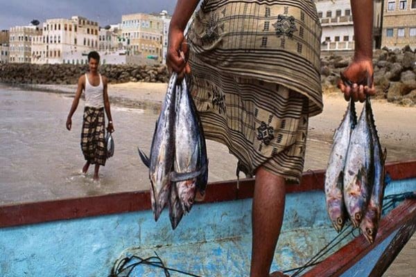 صياد في عدن يحمل رزقه من الأسماك خارج قاربه الخشبي الأزرق الصغير