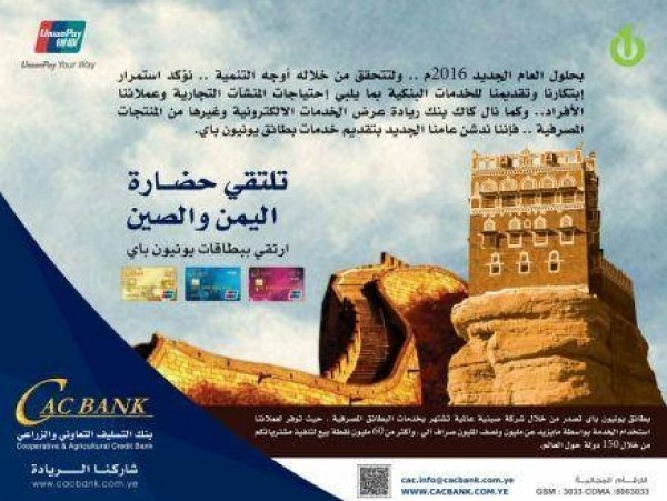 أكد رئيس قسم الترويج معاذ السياغي قدرة البنك التنافسية في القطاع المصرفي اليمني وريادته لهذا القطاع كبنك منافس وقوائمه المالية تأتي دائماً في أوائل قائمة البنوك اليمنية ،منوهاً أن البنك يؤكد إستمرار إبتكاره للخدمات المصرفية الحديثة بإعتباره قائد مسيرة التحولات المصرفية لما من شأنه خدمة الاقتصاد الوطني وتلبية إحتياجات عملائه من خلال الخدمات الالكترونية والمنتجات المصرفية والتى كللت بخدمة بطاقات اليونيون باي العالمية والتى تتيح للعملاء استخدام أجهزة الصراف الآلي ونقاط البيع التابعة للبنك وكذلك استخدامها عبر
