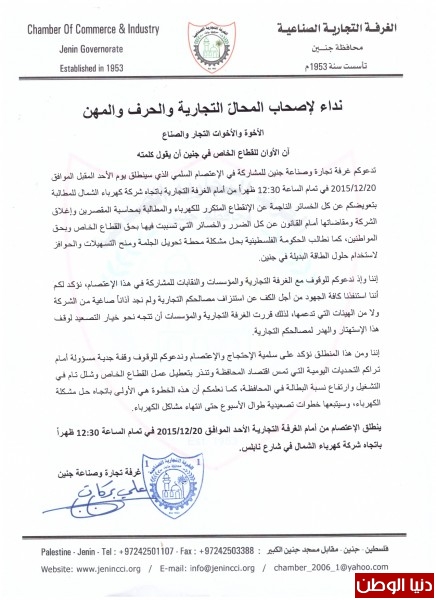الغرفة التجارية في جنين تدعو التجار للإعتصام احتجاجاً على سوء خدمات الكهرباء